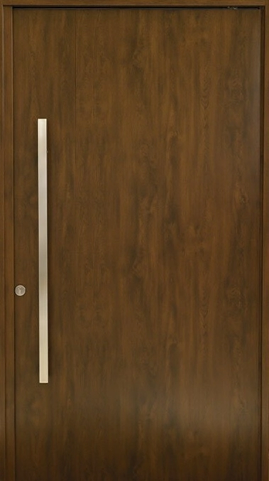 Puerta Pivotante doble chapa inyectada con poliuretano expandido y galvanizada de 47mm de espesor, m/chapa Nº18, terminación simil madera nogal de alta densidad, libre mantenimiento,  incluye barral, cerradura cilindro europerfil y llaves codificadas.
